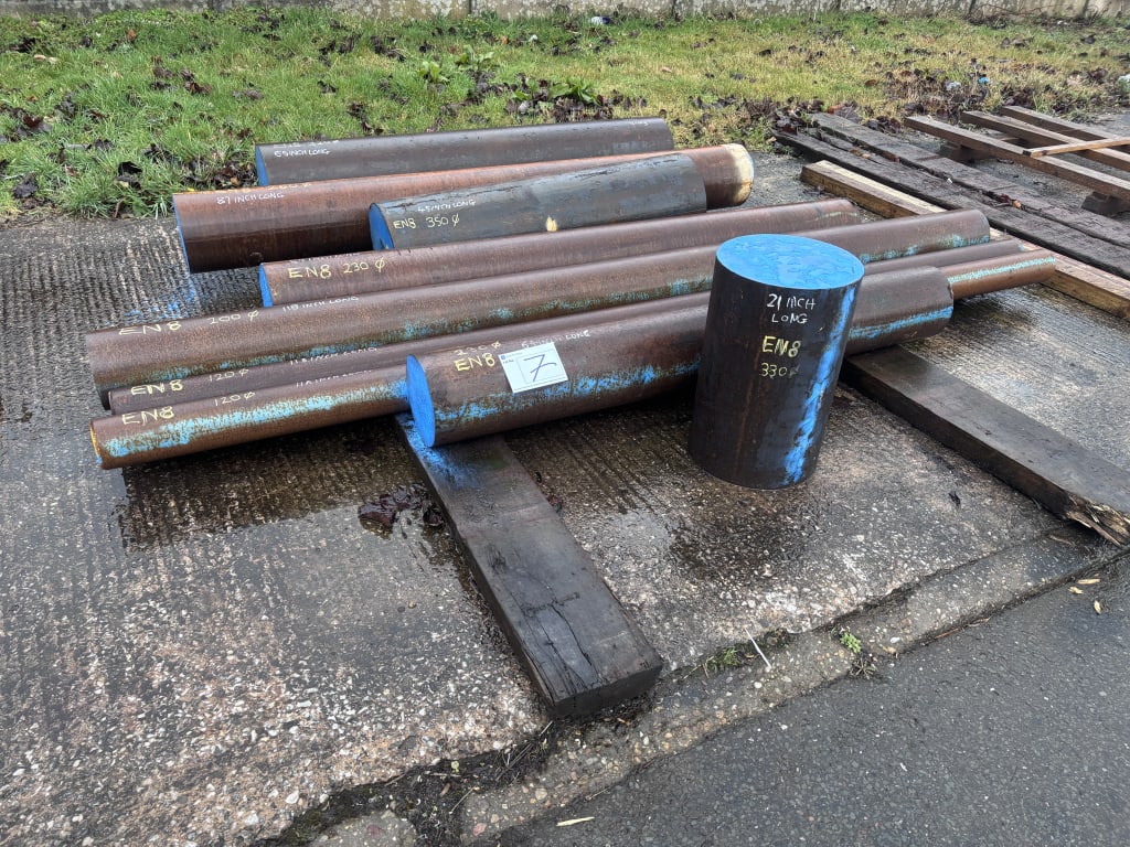 - ViewAssorted EN8 Steel Stock BarBar Dimensions Ø350 x 1.14m (880kg), Ø330 x 0.53m (387kg), Ø320 x 1.65m (1,162kg), Ø260 x 2.21m (1,264kg), Ø230 x 2.13m (1,080kg), Ø230 x 1.63m (823kg), Ø200 x 3.00m (1,319kg), Ø120 x 3.00m (791kg) & Ø120 x 3.00m (791kg).