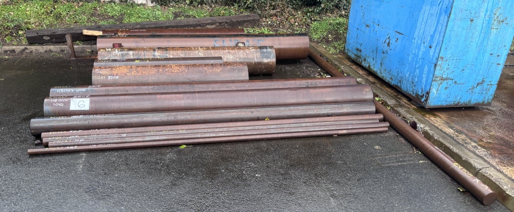 - ViewAssorted EN36/EN19T Steel Stock Bar With Material RacksBar Dimensions Ø280 x 3m (1,846kg), Ø600 x 3m (396kg) & Ø350 x 1.98m (396kg).